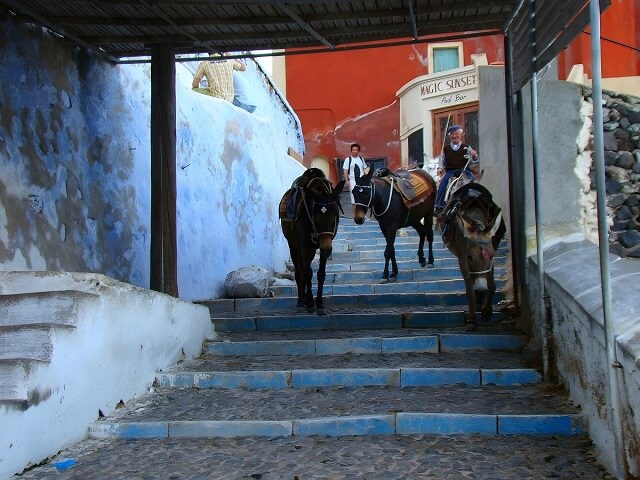 Z portu do Firy bardzo imponuje kolejka linowa — przejazd krótki, ale widowiskowy. Kosztuje 7 euro, działa od 6:30 do 22:00. Tradycyjny, ale egzotyczny sposób poruszania się — osiołki, które wożą pasażerów wąskimi uliczkami miast.