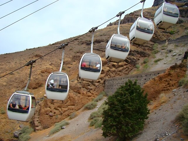 Najlepszym sposobem, aby dostać się z portu do Fira, jest przejażdżka kolejką linową: jest krótka, ale bardzo imponująca. Koszt takiej przyjemności to 7 euro, a godziny pracy kolei linowej to 6:30-22:00. Tradycyjnym, ale nietypowym dla podróżnych środkiem transportu w Grecji są osły, które wożą pasażerów po wąskich uliczkach miast.